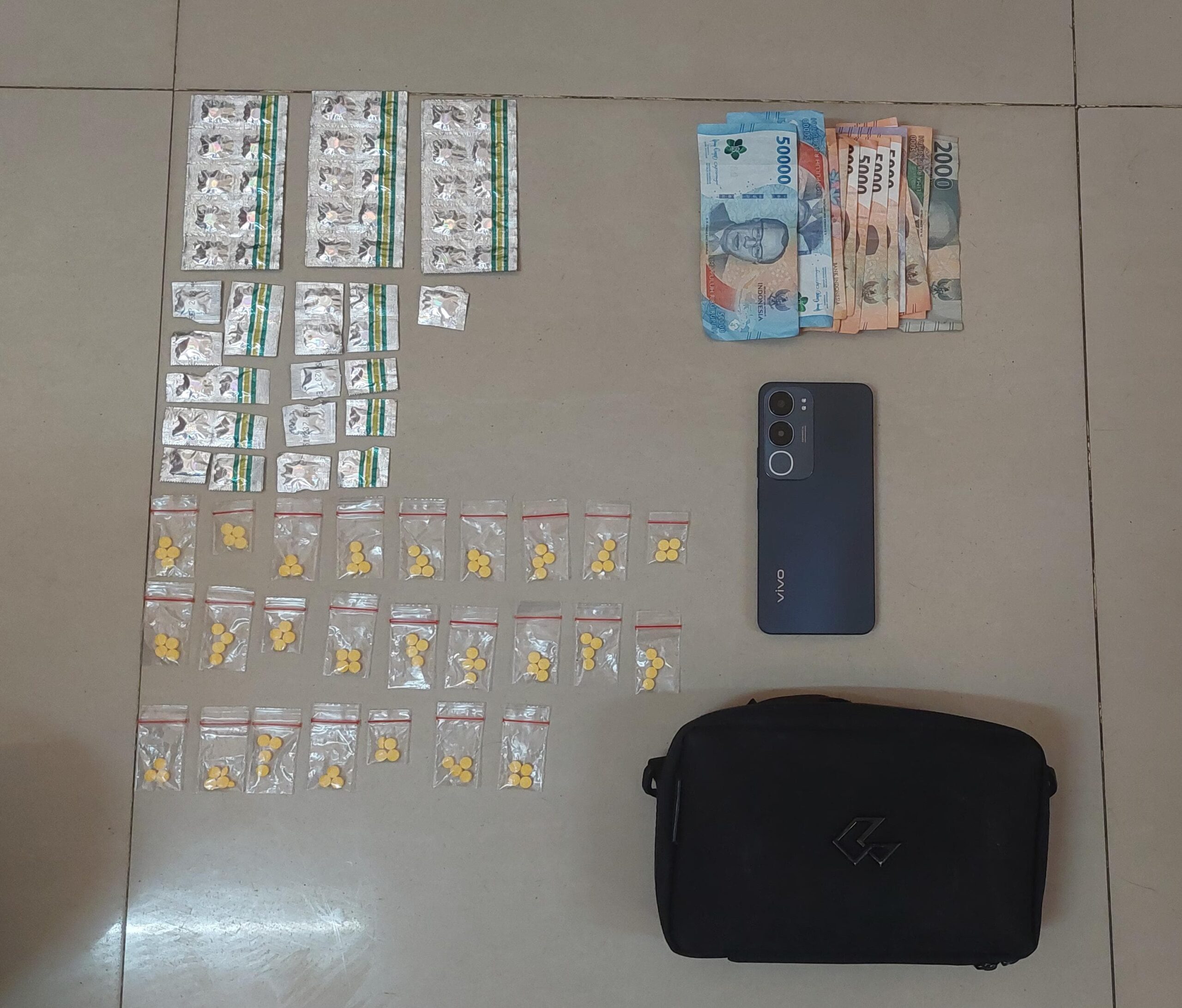 Dari hasil penggeledahan, petugas mengamankan barang bukti berupa 51 butir obat jenis Tramadol HCl, 95 butir obat jenis Heximer, uang tunai sebesar Rp152.000 yang diduga hasil penjualan, 1 buah tas selempang, serta 1 unit handphone merek Vivo warna biru dongker.